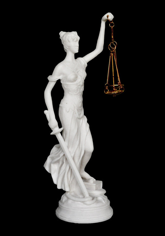 Themis Justitia - Greek Roman Goddess of Divine Law and Order, Fairness, Natural Law and Custom - Aged Alabaster Statue