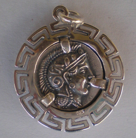 Owl of Wisdom - Athena Minerva Greek Roman Goddess of knowledge - Meander Design - Coin Pendant - 925 Sterling Silver