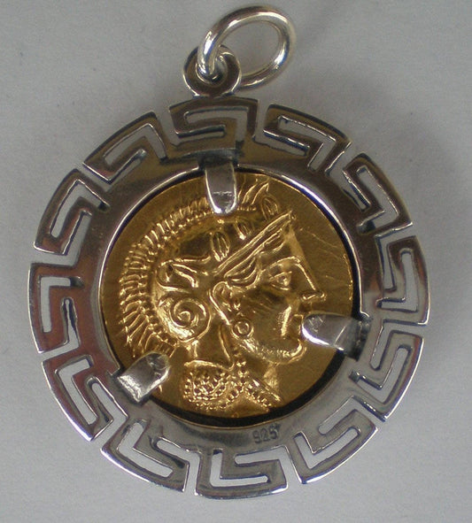 Owl of Wisdom - Greek Roman Goddess Athena Minerva - Meander - Gold Plated Coin Pendant - 925 Sterling Silver