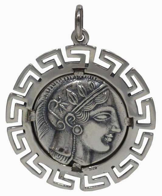 Owl Of Wisdom and Knowledge - Goddess Athena Minerva and Meander Design - Ancient Greece - Pendant - 925 Sterling Silver