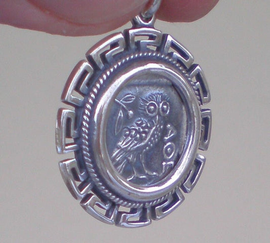 Owl, symbol of Wisdom and Goddess Athena - Meander, symbol of eternity - Coin Pendant - 925 Sterling Silver