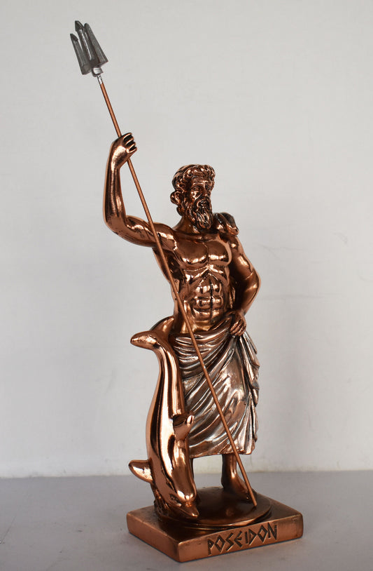 Poseidon Neptune - Greek Roman God of the Sea, Storms, Earthquakes and Horses - Protector of Seafarers - dolphin - Copper Plated Alabaster
