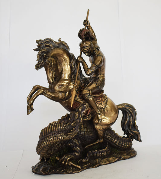 Saint George kills a Dragon with his Lance - Legend - Rescues the Princess as the next Offering - Cold Cast Bronze Resin