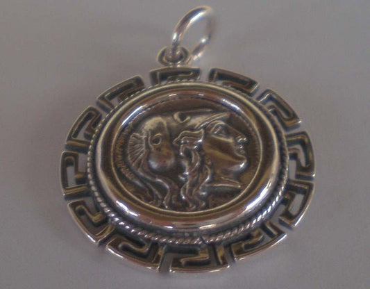Greek Roman Goddess Athena Minerva - Meander Design - Coin Pendant - 925 Sterling Silver