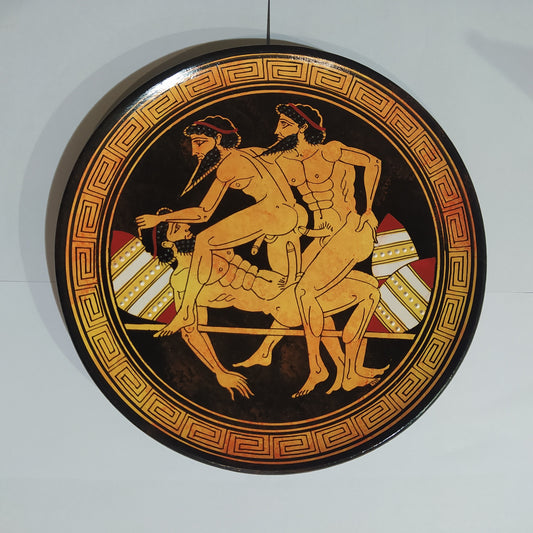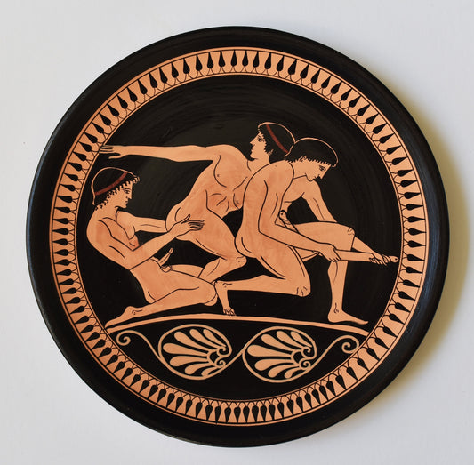 Homoerotic Scene between Three Males - Athens, 500 BC - Representation of Red Figure Vessel - Ceramic - Meander design - Handmade in Greece