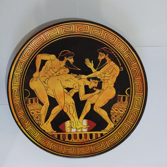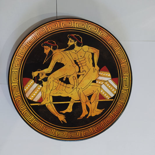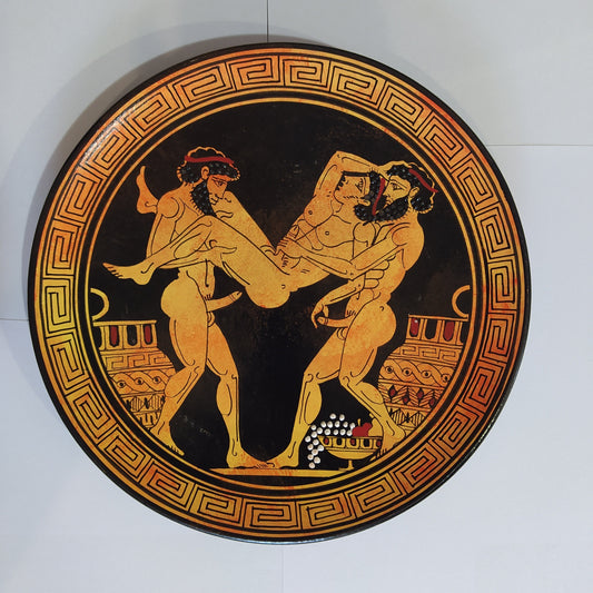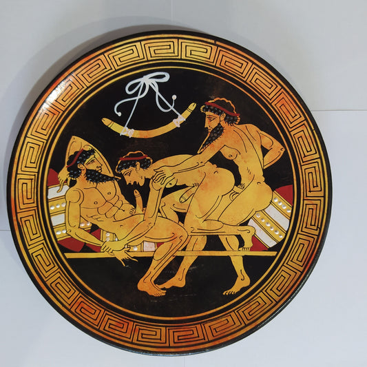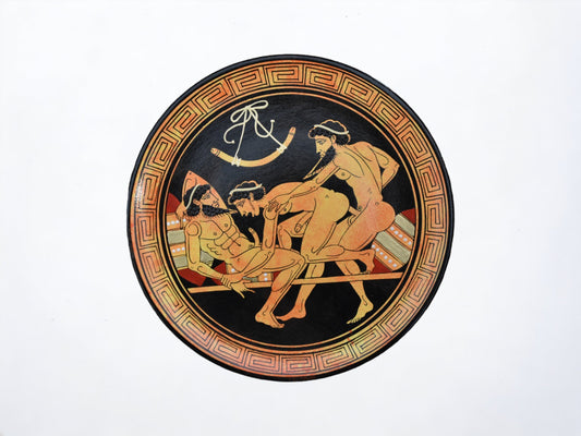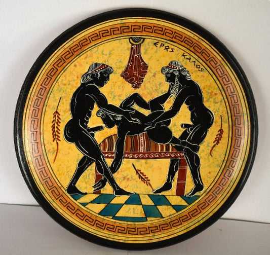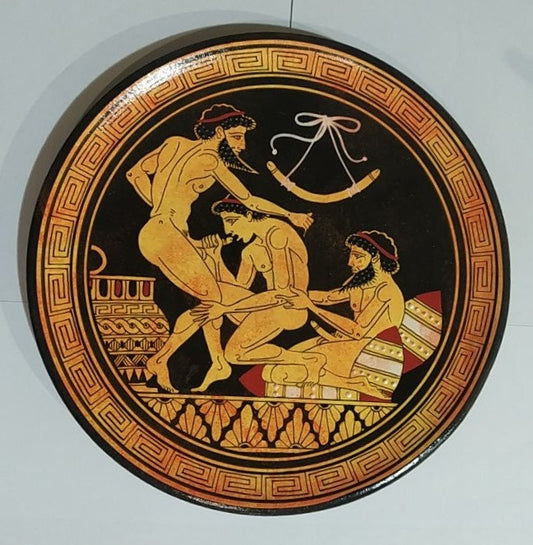 Homoerotic Scene between Three Males - Athens, 450 BC - Representation of Red Figure Vessel - Ceramic - Meander design - Handmade in Greece