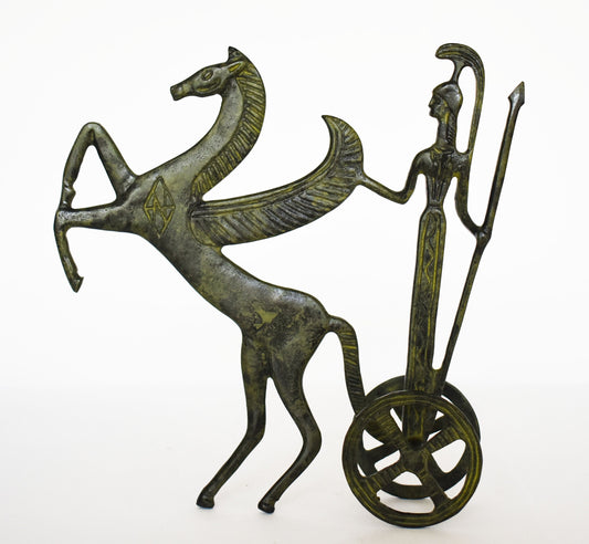 Ancient Greek Chariot - Goddess Athena with Spear and Pegasus, the Flying Horse - Small - pure Bronze Sculpture