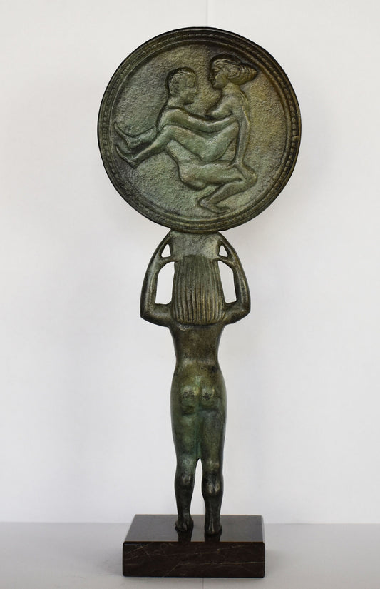Ancient Greek Mirror - Male Figure and Couple in Love - Museum Replica - Marble Base - Pure Bronze Sculpture