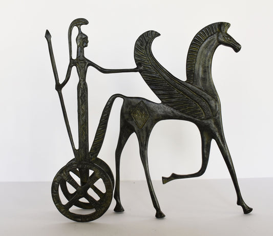 Ancient Greek Chariot - Goddess Athena with Spear and Pegasus, the Flying Horse - Small - pure Bronze Sculpture