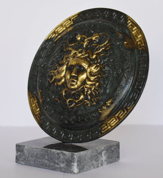 Ancient Greek Medusa Shield - marble base - Museum Reproduction - pure Bronze Sculpture