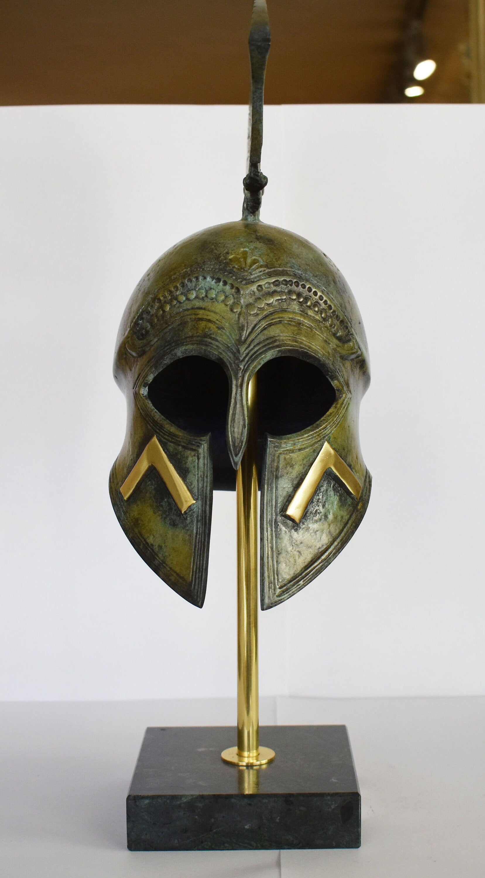 Ancient Greek Spartan Helmet - Λ Symbol - Battle, Fight, War - Marble Base - Museum Reproduction - Pure Bronze Statue