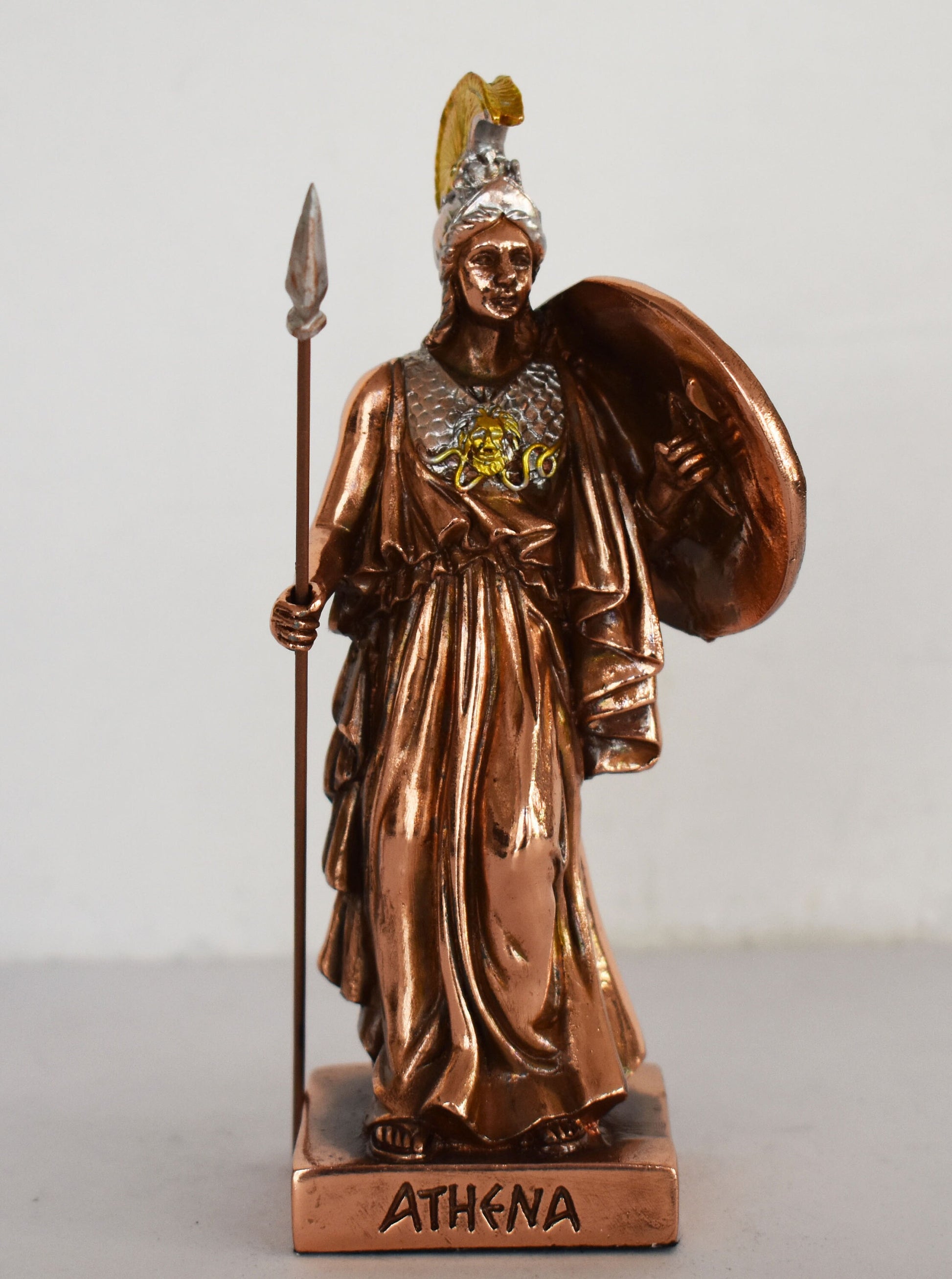 Athena Minerva holding a spear - Greek Roman goddes of Wisdom, Strength, Strategy, Courage, Inspiration, Arts - Copper Plated Alabaster